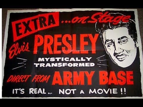 Sadly, I can find no description of the resurrection of James Dean, so I don’t know whether it was simply an actor in a costume or a Pepper’s Ghost-style illusion with a cardboard cutout, or something else. In 1958, with Elvis Presley serving in the Army and stationed in Germany, Kara Kum claimed he could magically teleport Presley’s spirit to appear on stage. Again, I could find no description of the trick, which must have used he same mechanics.